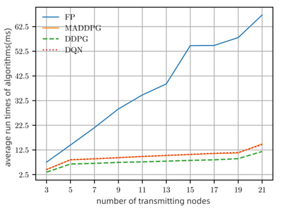 Figure 8 compares the computational complexity of different algorithms as the number of network nodes increases. We use the program running time to complete one-time power allocation as a metric. From Figure 8, we can see that the number of nodes affects the complexity of the algorithm. The algorithms of MADDPG, DQN, and DDPG have approximately the same complexity, while FP is much higher. The per-iteration complexity of FP is ), while the others are or less. Note that random and maximum power allocation algorithms are excluded from Figure 8 since they do not need additional calculations.
