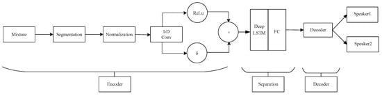 The authors of [22] state that the audio segmentation size of TasNet is 5 ms, which is much smaller than the typical frame size of 32 ms used in STFT. Therefore, TasNet can achieve real-time processing, and the performance of the estimated separated signals in terms of signal-to-noise ratio (SNR) is superior to that of the DANet. Since then, many related studies on speech separation have leaned towards developing methods based on the time domain.
