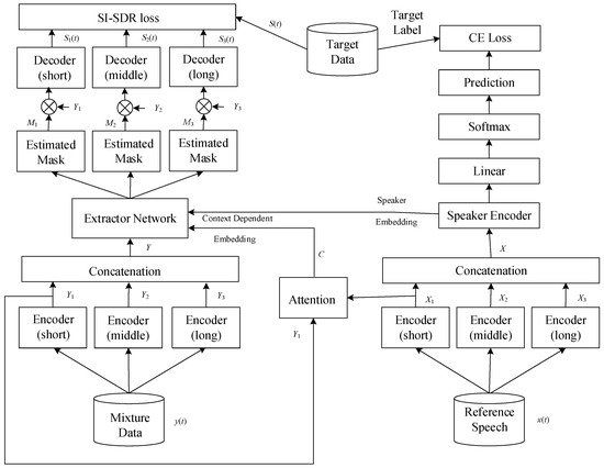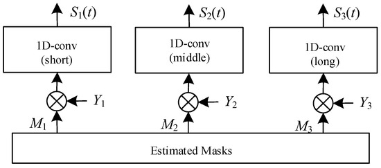 where ⨂ denotes element-wise multiplication between matrices, represents the mask for the corresponding encoder–decoder of different lengths, and is the estimated target speech obtained via the corresponding encoder–decoder operation. The final estimated speech is then used to calculate the loss function to assist in updating the parameters of the neural network model.