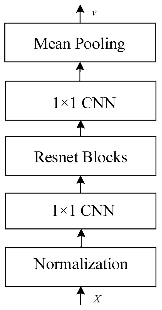First, we will explain the generation of speaker-embedding vectors. Figure 7 shows the encoder architecture to generate speaker-embedding vectors. The target feature matrix X, which is generated by the audio encoder, is used as input. Layer normalization (LN) [28] is performed first. The operation normalizes all feature dimensions of each individual sample. Then, a 1 × 1 convolutional layer (1 × 1 CNN) is applied, which is a convolutional layer with a kernel size of 1. Its function is to adjust the dimensionality, which can reduce or increase dimensions and allow information to flow between channels. After passing through the 1 × 1 convolutional layer, a residual network (ResNet) [29] is used as the main architecture of the encoder. In this paper, three ResNet blocks are used, and the internal structure of the block is shown in Figure 8. These blocks are designed to help the network learn an identity function, which ensures that the higher layers of the network can perform at least as well as the lower layers, and thus, can avoid the problem of vanishing gradients in deep networks. After the ResNet blocks, another 1 × 1 CNN layer is used to further refine the features extracted via the network. The use of 1 × 1 convolutions helps in reducing the dimensionality and adding non-linearity to the model without affecting the receptive field of the convolutional layers. Finally, mean pooling calculates the mean of the elements in the window of the feature map. Embedding vector (v) captures the characteristics of the speaker’s voice.