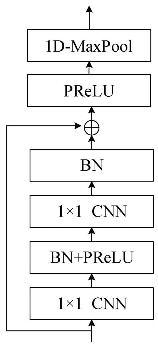 Thus, if the learning in a layer has no effect, i.e., the residual is zero, the input will be passed to the next layer, preventing degradation. As shown in the structure in Figure 8, two 1 × 1 convolution layers are used to learn the residual, with batch normalization and PReLU interleaved to avoid gradient vanishing and aid convergence. The skip connection adds the input to the learned residual to obtain features, which are then limited in value range using PReLU. At the end of the block, a maximum pooling layer with convolution kernel size of 1 × 3 is used to remove silent parts of the audio. After passing through the ResNet, the dimensions of features are adjusted to be consistent with that of the target speaker-embedding vector using a 1 × 1 convolution layer, and mean pooling is applied along the time dimension to convert the feature matrix into an embedding vector v.