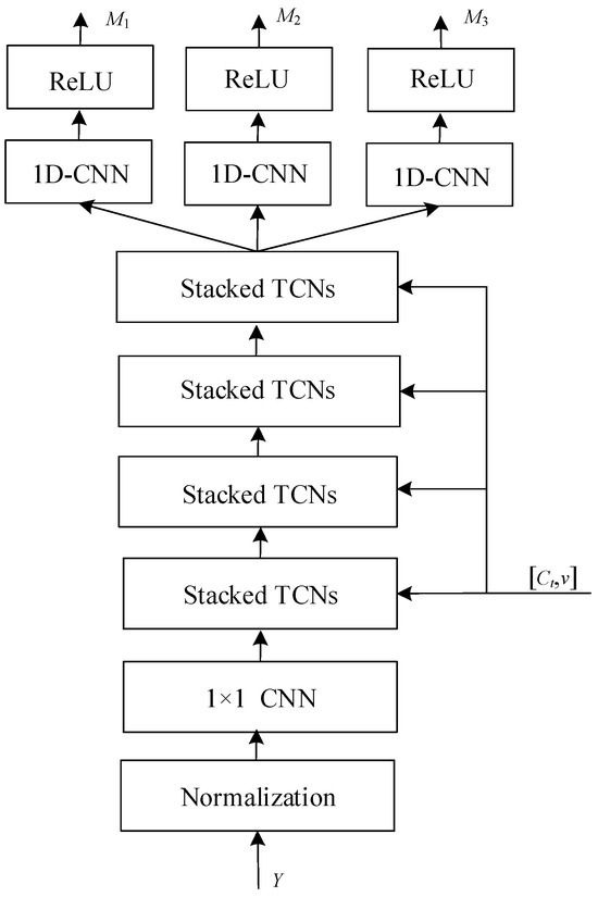 The purpose of the speaker extractor is to use the target embedding vector to estimate the target mask. Figure 10 shows its architecture, which starts with layer normalization and dimension adjustment using a 1 × 1 convolution layer. The input signal y is first normalized to ensure consistency in the range and distribution of input data values, which is crucial for the effective training of neural networks. After normalization, the data is passed through a 1-dimensional convolutional neural network (1D-CNN) layer, which applies a series of filters to extract time-invariant features from the signal. The “1 × 1” refers to the kernel size, meaning that the convolution is applied to each point individually along the time axis. The main body is composed of a temporal convolutional network (TCN) architecture proposed by Conv-TasNet [30], including four stacked TCNs. The stacked TCNs receive the target embedding vector as an additional input to filter the target features. Each TCN block is followed by another 1D-CNN layer, which serves to refine and transform the features further. Each stacked TCN is composed of eight TCN blocks. The rectified linear unit (ReLU) activation function is applied after each 1D-CNN layer. ReLU introduces non-linearity to the model, allowing it to learn more complex functions. Finally, the network outputs multiple embeddings (M1, M2, M3), which are speaker-specific features at various levels of abstraction, corresponding to three encoder lengths.