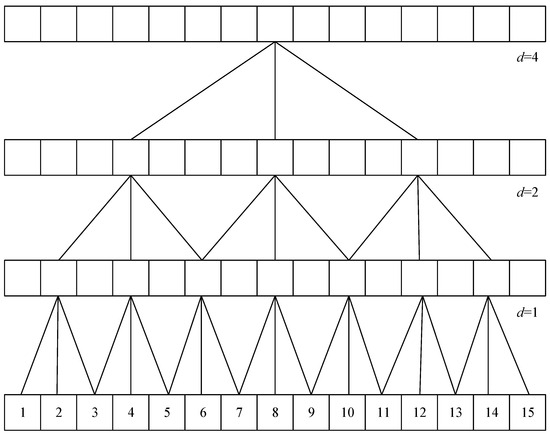 The dilated convolutional layers (De-CNN) [31] is also employed in the model. The special feature of the dilated convolutional layer is that it allows for interval subsampling of the input, meaning that the spacing of each point in the convolutional kernel can be adjusted to create sparse variations. The spacing size is controlled by the dilation factor d, which is 1 in normal convolutional layers. In the TCN module, the dilation factor is set to for the eight blocks, where b = 0, 1, 2, …, 7, as shown in Figure 12. The deeper the block, the larger the spacing, which means that the receptive field expands and the computation cost is reduced. By using different receptive field sizes, the convolutional neural network can learn different combinations of feature variations and understand the degree of temporal changes, enabling the network to have the ability to interpret temporal significance.