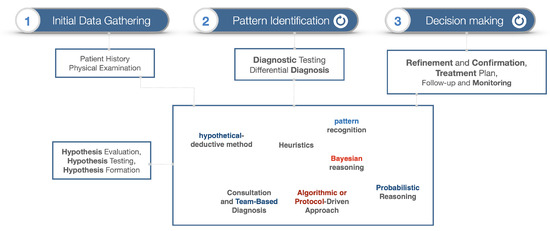 Healthcare experiences for patients are multifaceted, encompassing dynamic doctor–patient interactions, diverse diagnosis and treatment methods, adherence to recommended lifestyle or suggested behavioral changes, and ongoing preventive health measures. A patient’s healthcare journey is clearly non-linear, forming a comprehensive and interwoven sequence of events and encounters [1,2,3,4]. For example, the diagnostic procedure in medicine often combines different approaches, which are influenced by the context, patient symptoms, clinician expertise, and available diagnostic tools [5]. Indeed, as illustrated and summarized in Figure 1, the diagnostic process begins with gathering patient data, including a medical history and possibly a physical examination. This information is then analyzed for patterns to assist in decision making. The process further refines and confirms initial hypotheses about the condition using the collected data, which leads to the creation of a treatment strategy, the monitoring of patient progress, and the tracking of disease progression.