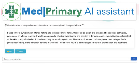 In this paper, we present a novel Artificial Intelligence (AI) -empowered system that enhances large language models and other machine learning tools with rules to provide primary care diagnostic advice to patients. Specifically, we introduce a novel methodology, represented through a process diagram, which allows the definition of generative AI processes and functions with a focus on the rule-augmented approach. Our methodology separates various components of the generative AI process as blocks that can be used to generate an implementation data flow diagram. Building upon this framework, we utilize the concept of a dialogue process as a theoretical foundation. This is specifically applied to the interactions between a user and an AI-empowered software program, which is called “Med|Primary AI assistant” (Alpha Version at the time of writing), and provides symptom analysis and medical advice in the form of suggested diagnostics. By leveraging current advancements in natural language processing, a novel approach is proposed to define a blueprint of domain-specific knowledge and a context for instantiated advice generation. Our approach not only encompasses the interaction domain, but it also delves into specific content that is relevant to the user, offering a tailored and effective AI–user interaction experience within a medical context. Lastly, using an evaluation process based on rules, defined by context and dialogue theory, we outline an algorithmic approach to measure content and responses.
