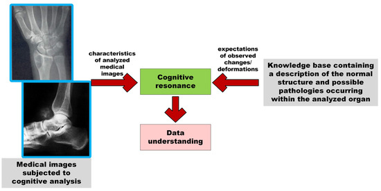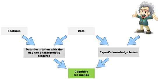 Expectations generated based on existing knowledge about the analysis process being carried out do not give the possibility for the full interpretation of the data [5,6]. The results are formed by comparing the expectations with the characteristics of the analyzed data sets. The construction of a set of such characteristics is possible based on a complete description of the characteristics that are typical of the analyzed datasets and that are not present in other datasets. This is because it allows for the unambiguous classification of the data sets based on a description that unambiguously identifies a class. Features that identify specific data sets and are also their characteristic markers are compared with expectations, that are generated based on expert knowledge. This phenomenon is called cognitive resonance (Figure 1) [4].