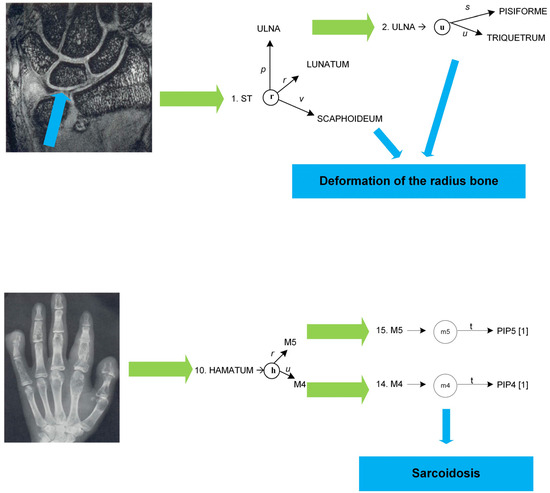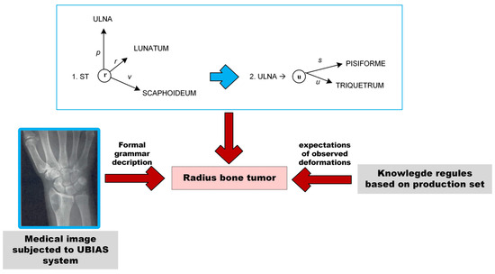 Experiments related to the use of cognitive systems to analyze wrist X-ray images were carried out on a set of several dozen images available in online medical databases (e.g., Kaggle, Bone Fracture Vision Project, etc.), which included cases of normal images as well as various disease entities, including hand fractures and carpal bones, bone displacement, and loss of small bones due to abnormal metabolic processes. In particular, the analyzed images showed the following pathological changes: finger fractures, hand bone fractures, degenerative changes, hand deformations, bone displacements, arthritis, and the tuberculosis of bones. The analyzed images were preprocessed using a number of operations, such as thresholding, skeletonization, edge detection, and the determination of the centers of gravity of the bone elements visible in the image. Information about other possible disease cases regarding the structure and morphology of the wrist bones was also obtained in cooperation with radiologists and orthopedists. This made it possible to introduce very representative grammatical descriptions, taking into account both the analyzed structures and other possible disease cases. The last step was the implementation of syntactic analyzers that served as procedures for recognizing and classifying the meaning of disease cases.