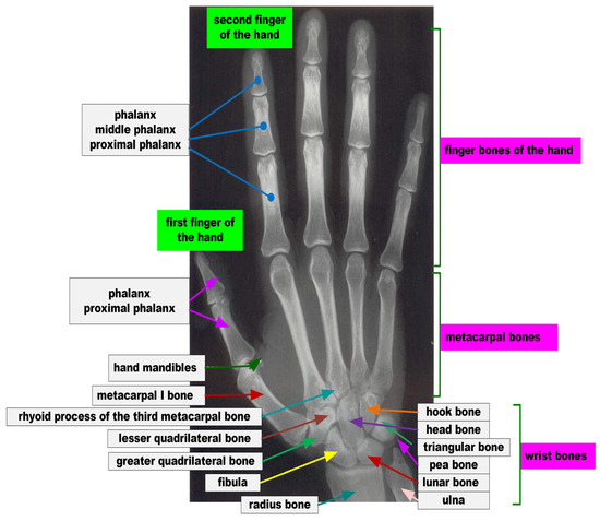 For the correct analysis of the imaging of the wrist bones and the hand bones, the medical nomenclature of the individual bones was adopted for the correct structures of the wrist and hand.