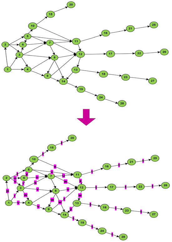 The result is an image that makes the contours of the studied structure visible with the help of which we can introduce a new representation in the form of a linguistic graph, as shown in Figure 6. This representation allows us to define all of the independent fragments of the studied structure, determine their number, as well as their mutual spatial relationships. These are important parameters, since disease processes can, on the one hand, change the shape of the studied structures, but also cause their disappearance (i.e., reduce the number of visible elements), or cause their movement (e.g., as a result of trauma or injury). Once the linguistic representation is in place and all of the required sets of grammars (i.e., vertex labels of the graph, edge labels, terminal elements, non-terminal elements, and relations between structures) are defined, it is possible to define sets of grammar rules that will describe normal structures and those with pathological changes, as shown in Table 1 and Table 2.