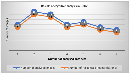 The effectiveness of developed cognitive systems in the process of diagnosing existing disease lesions was determined as a measure of the compliance of the diagnostic description of the disease with its automatic diagnosis. This means that each diagnosed disease case already had a diagnostic description prepared by a specialist. The results obtained by the cognitive systems were compared with these descriptions to confirm their agreement or discrepancy. Coefficients and statistical measures determining the effectiveness of the analysis are presented in Figure 8 and Figure 9, Table 3.