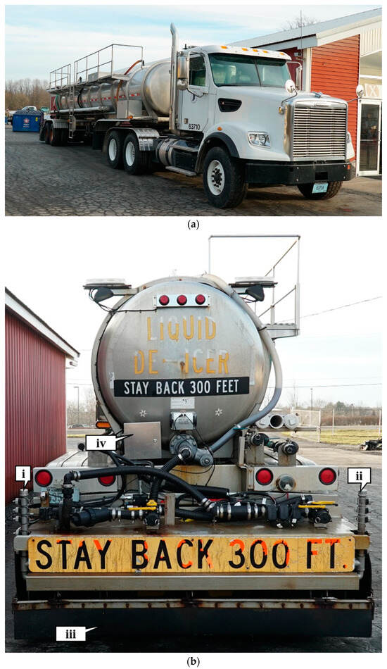 Most agencies use solid material for de-icing chemicals on their road network during a winter storm event and use brine for pre-treatment anti-icing [4,5]. Brine is usually more effective than rock salt for anti-icing pretreatment as the material adheres to the road surface. In contrast, the scatter and bounce of rock salt on a dry road often results in substantial waste. Indiana brine application varies from slide-in 1000-gallon brine tanks in their dump beds on smaller routes to large 5500-gallon tankers on high volume interstates. Figure 2 shows one of many brine tankers in the agency’s fleet. Figure 2a shows the tractor where the operator drives and operates the system and Figure 2b shows the application equipment and nozzles in the rear. In Figure 2b, a left spray bar, right spray bar, and center spray bar can be seen as callout i, ii, and iii, respectively. These options enable the operator to manage applications in both the travel lane (callout iii), as well as short duration applications in adjacent lanes (callout i, ii) and adjacent exit/entrance ramps. Callout iv shows the control box for the solenoid that controls each valve for the respective spray bar.