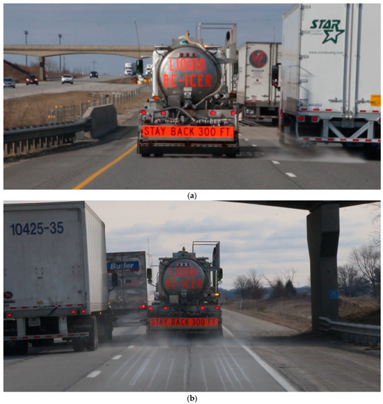 An example of brine application can be seen in Figure 3. Depending on the type of winter storm, the agency has three types of anti-icing procedures, including no application of brine, which usually occurs if rain is predicted in advance of the storm, spot treatment of bridge decks and underpasses as they are prone to freezing first, and complete application on all roadways and lanes. Figure 3a shows an example of spot treatment with the brine tanker applying material on the bridge deck from the center, and the right spray bar (Figure 2b, callouts ii and iii) capturing both lanes in a single pass. Figure 3b demonstrates the application of material on an underpass from the left and center spray bar (Figure 2b, callouts i and iii).