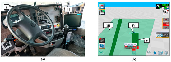 The development of automated brine began with the adaptation of a precision agriculture controller. Figure 5a shows the interior of the truck cab with callout i being the standard truck operation and perspective. The user interface controller, a global navigation satellite system (GNSS) antenna, solenoid control module, and wiring harness are four pieces of equipment from the agricultural industry required to automate the brining controls [39,40]. The user interface controller (callout ii in Figure 5a) is a Raven Viper 4, a 12.1-inch touch screen with the Raven Operating System installed. The GNSS antenna is a Raven 500S that has 114 channels, a 10 Hertz update rate, 3-channel satellite-based augmentation systems (SBAS) tracking, and it has 0.3 m horizontal accuracy with SBAS [41]. The standard brining equipment originally installed on the tanker by the Department of Transportation was integrated with the automated system components with minimal impact to the mechanisms, which includes the hydraulic wet-kit, brine pump, spray nozzles, and brine tank, which can be seen in Figure 2. The automated brine system added a controller in the cab of the truck near the operator, seen as callout ii. The operation of the automated brine tanker relies on pre-defined application zones for bridge decks/underpasses or perhaps the whole road surface for long segments in some cases. These zones are defined offline in a geographic information system (GIS) package to generate the geofence boundaries. In general, this can be performed with sufficient accuracy using Google Earth imagery.