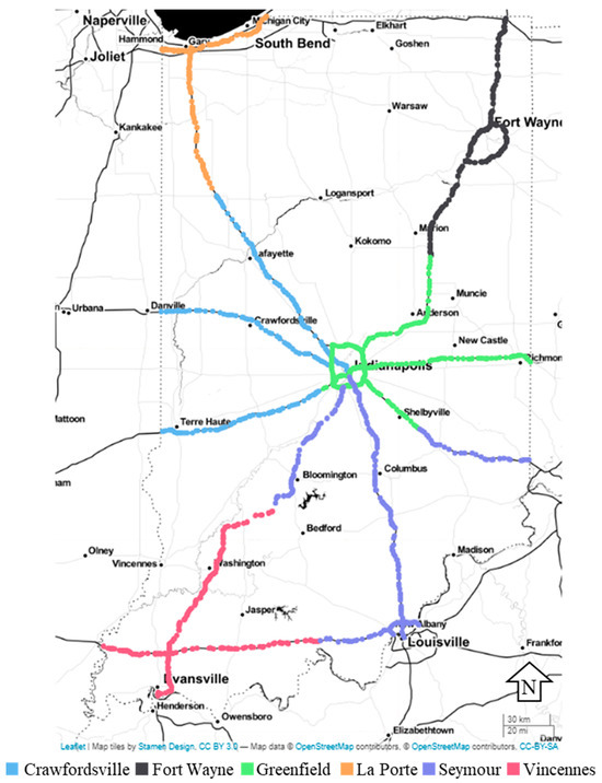 - Indiana Department of Transportation. Traffic Count Database System (TCDS). Available online: https://indot.public.ms2soft.com/tcds/tsearch.asp?loc=Indot&mod=TCDS (accessed on 28 July 2023).