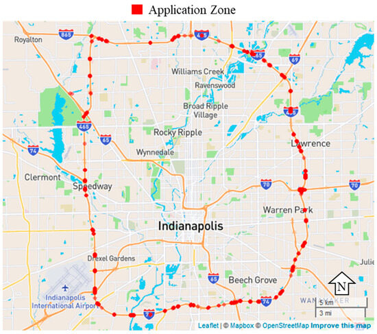 A more localized example on I-465 shows the impact on one driver. In the Indianapolis area (Greenfield District), there are bridge decks on average every 0.5 miles on I-465, resulting in approximately 100 application zones. Additionally, with 6–10 lanes on this route, an operator would have to manually activate the application 1200 times just to brine a minimum of three lanes in each direction. Figure 7 below shows all the application zones on I-465, with the interstate loop around Indianapolis having an average annual daily traffic count varying from 100,000 to 200,000 vehicles [42]. The implementation of this automated liquid brining system enhances overall safety by reducing driver workload and eliminating the 1200 times the driver must divert some attention to turning a switch on or off.