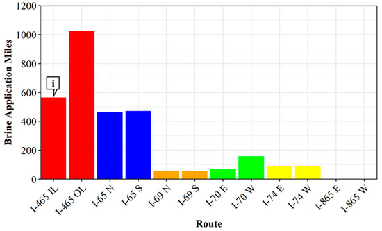 One of the advantages of the automated brining system is the ability to track and monitor the material application and its location. During the 2022–2023 winter season, a total of 3053 miles of brine was applied using this technology equipped on two tankers. Additional tankers were finished at the end of the winter season and were not utilized in this analysis except for testing. Application was focused on urban interstates to utilize the system in the most challenging conditions. Figure 8 shows equal application per direction on each route, which is expected, with the exception of I-465. On I-465, due to the magnitude of the roadway, additional brining vehicles not equipped with the automated brine controller assisted with brining, reducing the number of application miles on the I-465 inner loop (callout i).