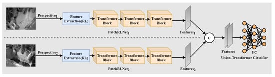 Figure 2 illustrates the multimodal process for the automated detection of PTFE emulsion–paraffin separation. Image sequences X and X, acquired from two different viewpoints, serve as inputs for two PatchRLNet models—PatchRLNet and PatchRLNet. Both PatchRLNet and PatchRLNet share the same architecture and undergo independent training. Subsequently, by modifying the output of PatchRLNet, we use it as different branches for the classifier to achieve integration. Specifically, the latent representations obtained from the backbone structures of PatchRLNet and PatchRLNet are added, and the resulting new class token is input into the vision transformer classifier to obtain the final result.