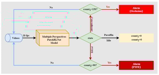 In the actual production process of the PTFE emulsion, occlusions may occur due to the operational needs of on-site personnel, potentially leading to brief interruptions in the camera view. To mitigate continuous alarms triggered by these momentary occlusions, we implemented a counting mechanism for occlusions. The system issues an alert only when the output state is occluded 150 consecutive times (within a 5 s interval), indicating an unexpected obstruction of the lens by some object. Otherwise, the model restarts the counting process. Similarly, the system issues an alert to personnel to close the valve only when the model detects continuous PTFE emulsion overflow for 3 s. All thresholds mentioned are set based on the actual requirements of the enterprise and can be adjusted as needed when applied to different scenarios.