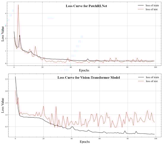 Utilizing the cross-entropy loss function as the standard for evaluating model performance during training, we visualized the changes in the loss curves for the training and test research sets during the training process of PatchRLNet and the standard vision transformer model, as depicted in Figure 4.