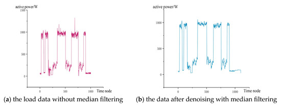 Therefore, this paper proposes the use of median filtering technology for denoising filtering [27]. Median filtering is a nonlinear signal processing technique based on the theory of order statistics. It is an effective noise reduction technique for on-site data collection, also known as a nonlinear filter or a statistical order filter. The principle of median filtering is to take each load data point of an electrical device as the center and convert this point into the median value of all data points within a certain neighborhood window [28].