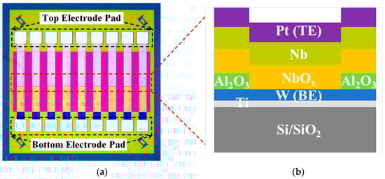 To fabricate the Mott memristor, a via hole (~10 µm) structure of Ti/W/NbOx/Nb/Pt crossbar is utilized on a silicon wafer with 300 nm SiO2. The bottom electrode (BE) and insulating layer are deposited using radio frequency (RF) magnetron sputtering, with Ti/W (~10 nm/80 nm) and Al2O3 (~30 nm), respectively. These layers are then patterned in a lift-off process. Subsequently, a NbOx (~50 nm) film is prepared as the switching layer using RF magnetron sputtering and a Nb target in an Ar:O2 = 30:2 sccm ambient at room temperature. Finally, the top electrode (TE) consisting of Nb/Pt (~50 nm/100 nm) is sputtered and patterned [,].