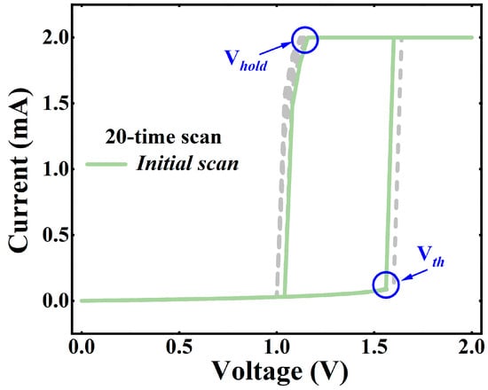 Figure 3 illustrates the current-voltage (I-V) DC sweep characteristic of the Mott memristor, showcasing its ability to undergo stable bidirectional transitions between low and high resistance states. As the applied voltage progressively increases from zero to approximately 1.57 V, a notable surge in current is observed, signifying a transition from the high-resistance state to the low-resistance state. This particular voltage level is commonly referred to as the threshold voltage (Vth). Conversely, when the voltage declines from 2 V to around 1.17 V, a sharp decline in current occurs, indicating a transition from the low-resistance state back to the high-resistance state. This specific voltage value is known as the hold voltage (Vhold).
