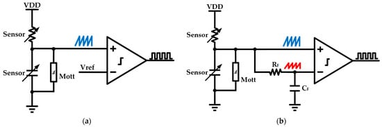 The narrow generator circuit is shown in Figure 5 and Figure 6. To simplify data processing, conversion of the spike wave from the Mott memristor array into a pulse wave is necessary. Initially, this is accomplished by shaping it into a square wave through the use of a comparator. The traditional scheme uses a reference voltage, as shown in Figure 5a, which means that additional voltage reference circuits are required, usually the bandgap voltage reference circuits with trimming, which apparently increases the complexity of the scheme. In addition, each Mott memristor requires a different reference voltage if the DC value of the spike wave is not fixed. Therefore, this scheme is not suitable for large sensor arrays due to inefficiency as well as inconvenience.