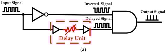 Generating a pulse wave from a square wave requires a delay unit made up of buffers and an adjustable resistor as shown in Figure 6a []. And the waveform diagram is shown in Figure 6b. The square wave is split into two signals, one of which is added to an inverter and the other to the delay unit. As a result, when the square wave signal turns to “0”, the inverted signal then turns to “1” and the delayed signal briefly remains “1”, the output of the AND gate is pulled up, generating a narrow pulse at the falling edge of the square wave.