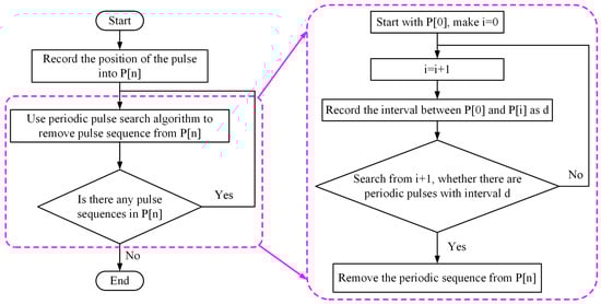 - If such a point exists, it signals the presence of a sequence of period d between P[0] and P[n]. The algorithm removes this sequence from the overall array and verifies whether any remaining recorded pulse positions exist. If there are remaining positions, the search algorithm continues as described above until no more recorded pulse positions remain in the array. If there are no remaining positions, the search algorithm has successfully identified the period information d0~dm represented by all the pulses in the array.