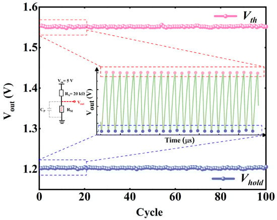 Figure 11 shows the oscillation driven by a current source. In this structure, the test conditions are an input current of 0.8 mA and CP of 4.7 nF. From the oscillation data for the first 100 μs, it can be seen that the oscillation frequency is about 210 kHz. In 20 oscillation cycles, Vth and Vhold remain stable around 1.55 V and 1.10 V, respectively. The measured results indicate that the Mott memristor is operating properly and stably.