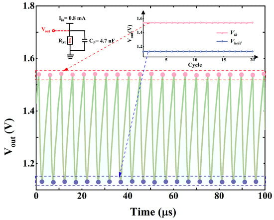 Figure 10 shows the oscillation driven by a voltage source. In this structure, the test conditions are an input voltage of 5 and RS of 20 kΩ. From the oscillation data for the first 20 μs, it can be seen that the oscillation frequency is about 1.15 MHz. In one hundred oscillation cycles, Vth and Vhold remain stable around 1.55 V and 1.20 V, respectively.