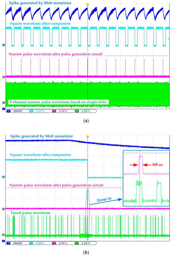 The Mott-based sensor interface has been measured in a previous work []. After several tests, the results show that at a pressure of 0.5 N, the pressure sensor resistance is 11.5 kΩ and the Mott memristor produces a stable frequency of 27.47 kHz. At pressures of 3.2 N, 4.6 N, and 8.8 N, the Mott memristor produces frequencies of 64.19 kHz, 100.10 kHz, and 137.00 kHz, respectively. In the test, the RC low-pass filter in the pulse generator has a resistance of 4.7 kΩ and a capacitance of 2.2 nF, producing a pole at 15.4 kHz. Applying different pressures to each pressure-sensitive sensor, the measured waveform of the single-wire output of the nine-channel pulse waveforms of the sensing system is shown is shown in Figure 12a. The zoom-in waveforms and the narrow pulses with a width of 100 ns are successfully obtained as shown in Figure 12b, where the Ch-1 is the spike waveform generated by the Mott memristor, Ch-2 is the square waveform after comparator, Ch-3 is the narrow pulse waveform after the pulse generation circuit, and Ch-4 is the fused pulse waveform.