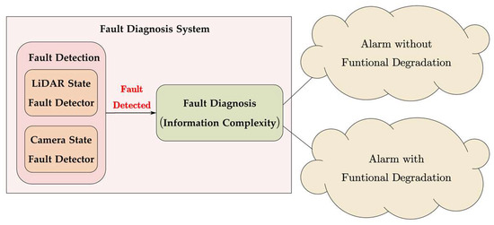 The aforementioned methods exhibit various advantages and drawbacks. For autonomous driving sensing systems, the hardware redundancy approach typically involves evaluating other types of sensor units based on a reference sensor unit. The primary challenge lies in balancing the structural differences in data and addressing spatiotemporal synchronization issues among heterogeneous sensor units. These handling methods often introduce delays, resulting in a notable disparity between the effectiveness observed in practical deployment and simulation results or offline testing [18,19]. Consequently, the accuracy and response time performance of fault diagnosis fall short of the optimal expectations. Among the redundancy analysis methods, model-based approaches require minimal real-time data for fault diagnosis. However, the diagnostic performance of model-based methods largely hinges on the clarity of the model representing the input–output relationship. In practical environments, precise models describing the system or process are often unavailable or challenging to obtain. Signal-based and knowledge-based approaches do not necessitate complete models, but the former’s performance significantly diminishes due to unknown input interference [20], and the latter incurs high computational costs due to its heavy reliance on extensive training data. In other words, the quality of measurement signals or collected data is crucial for these model-free methods. When discussing autonomous driving sensing systems, two critical aspects are the faults within the sensor units themselves and the spatiotemporal alignment among these sensor units [21]. On one hand, implementing hardware redundancy based on highly reliable sensor units can facilitate rapid fault detection. On the other hand, injecting information into multi-source heterogeneous sensor units allows for a complexity-based analysis of information, enabling a more accurate localization of faulty units.
