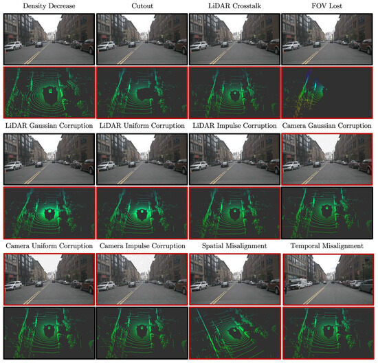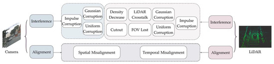 When units in the autonomous driving sensing system are subjected to various internal or external factors, such as intense vibrations [23] or strong glare [24,25], the transmitted data may experience degradation. Drawing upon discussions on sensor interference from existing research [26,27,28,29], we devised 10 significant interference-level disruptions. Fault factors for point cloud data encompass Density Decrease [30], Cutout [31], LiDAR Crosstalk, FOV Lost, Gaussian Corruption, Uniform Corruption, and Impulse Corruption. Fault factors for images include Gaussian Corruption, Uniform Corruption, and Impulse Corruption, allowing for the simulation of faults arising from extreme illumination or camera defects [32]. Regarding alignment-level faults, it is commonly assumed that LiDAR and camera outputs are perfectly aligned before being fed into fusion models. However, this alignment can deteriorate over extended periods of driving. For instance, the ONCE dataset [33] periodically recalibrates to prevent temporal misalignment among different sensors. Additionally, intense vibrations in the vehicle can cause spatial misalignment. The specific implementation of faults’ injection is detailed in Section 2.2.2.