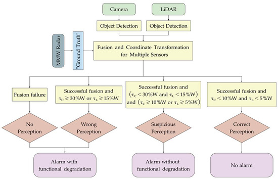 Flowchart of fault detector. , —the pixel Euclidean distance between the camera or LiDAR and the “ground truth”; —empirical value for the width of the target vehicle, = 1.6 m.