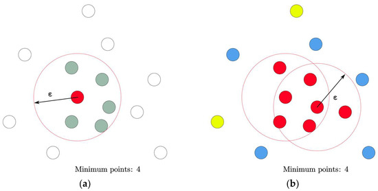 Concept of DBSCAN algorithm. Figure (a) describes the initial clustering principles, (b) illustrates the final clustering results.