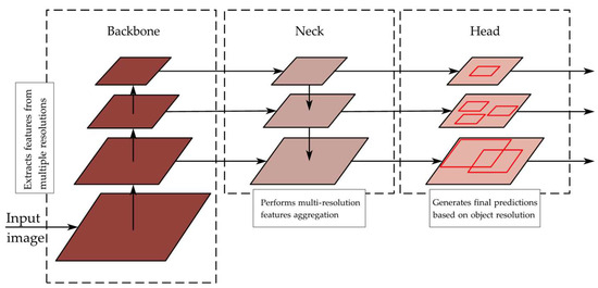 The YOLO model architecture follows a generic structure, wherein the backbone is responsible for feature extraction from an input image, the neck enhances feature maps through the combination of different scales, and the head generates bounding boxes for object detection.