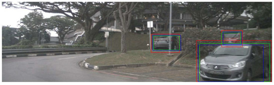 Prediction boxes of LiDAR (blue box), MMW radar (green box), and camera (red box).