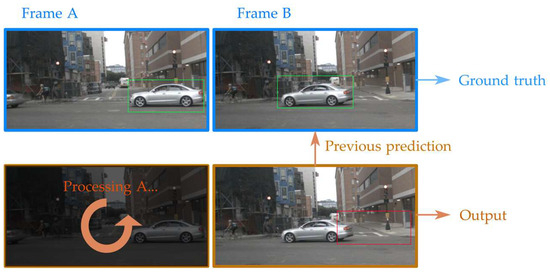 Illustration of the streaming evaluation in the fault detector. For every frame of “ground truth”, we evaluate the most recent prediction if the processing of the current frame is not finished.