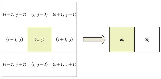 where is the frequency at which the feature pair appears, and the size of is . In our implementation, is derived from the eight adjacent neighbors of the center pixel, as depicted in Figure 11. In this context, we employed the concept of continuous entropy to circumvent the conversion from probability density distribution to a discrete probability distribution. The two-dimensional entropy is defined as follows: