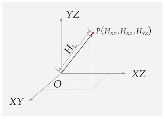Unlike images, LiDAR point cloud data contain three-dimensional spatial information. To comprehensively consider this information, we project each point onto the plane of the coordinate system (see Figure 12). By calculating the entropy for each plane, we obtain information complexity components, and finally, the spatial modulus is computed as a three-dimensional entropy measure. Also, we employed the concept of continuous entropy to circumvent the conversion from probability density distribution to a discrete probability distribution. The calculation process is as follows: