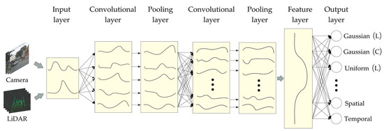 In addition to the 12 fault types injected in this study, real-world scenarios may involve other sensor types, and faults that occur simultaneously may result from various combinations of faults. While a numerical method reflecting fault types has been identified in the previous sections, achieving accurate identification under various conditions, akin to image recognition, is challenging with a fixed program. We observed that the method for fault discrimination in Section 2.4.3, which involves feature recognition through segmenting a segment of time-series data, is analogous to RGB matrices in image recognition. To identify different fault types from such sequential data, we propose an approach using Convolutional Neural Networks (CNNs). CNNs typically consists of two parts. In the first part, convolution and pooling operations are alternately used to generate deep features of the raw data. In the second part, these features are fed into a Multi-Layer Perceptron (MLP) for classification [46,47]. We present a CNN-based recognition model for fault diagnosis in autonomous driving sensing systems: Joint Training of Multivariate Time Series for Feature Extraction. Figure 14 illustrates our CNN architecture for the time-series classification of LiDAR and camera information complexity, including two convolutional layers and two pooling layers. It is noteworthy that faults manifest as significant abnormal fluctuations in time series images, often diagnosable through time–frequency transformations in the frequency domain. The essence of time–frequency transformations involves matching in the frequency domain, equivalent to convolution operations on time-domain signals. On the other hand, convolutional networks commonly used in image recognition can also be applied to extract features from time-series images. Regarding the depth of the convolutional network, due to the distinct features of fault manifestations and the simplicity of their time-domain data, increasing the depth of the network does not significantly enhance accuracy. Moreover, it incurs additional resource utilization, which is unfavorable for latency considerations. Therefore, through experimentation, we opted for a 2-layer convolutional network, which demonstrated superior performance in our experiments.