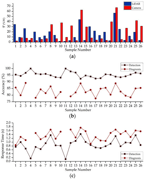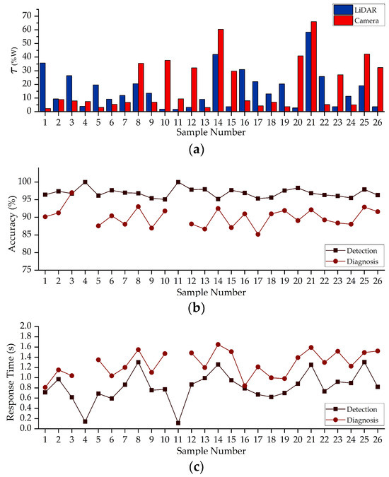 Results of the dataset from 26 experiment segments are extracted, where (a) represents the evaluation of fault detection for LiDAR and the camera using metric τ; (b) illustrates the accuracy of fault detection and diagnosis in the experiment segments, with the diagnosis accuracy calculated using the SoftMax output probabilities; (c) displays the response time of fault detection and diagnosis in the experiment segments.