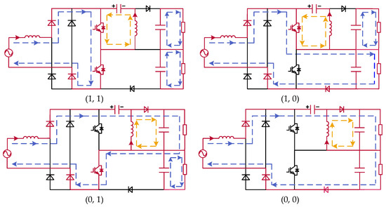 In each operating mode, the branch currents will flow in different paths; correspondingly, the capacitors Co1, Co2, and Cb and the inductors L1 and L2 will be in the status of charging or discharging. For example, when the circuit operates in mode (1, 0) as shown in Figure 2, S1 is in the “on” state, but S2 is in the “off” state. Correspondingly, the split capacitor Co1 is in the discharging state and the split capacitor Co2 is in the charging state. Meanwhile, the capacitor Cb is in the discharging state and the inductor L2 is in the charging state. In summary, the operating status of Co1, Co2, Cb, and L2 and the input voltage vi of the diode rectifier are all summarized in Table 1.