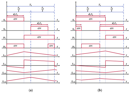 Main waveforms of the proposed rectifier: (a) 0 < d < 0.5; (b) 0.5 ≤ d < 1.
