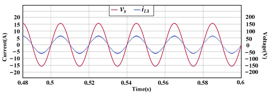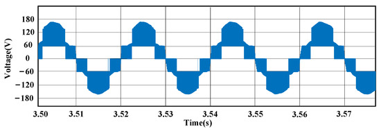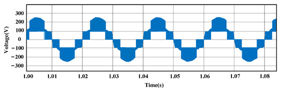 Our experimental setup featured a TMS320F28335 DSP as the core controller, and the rectifier was constructed using discrete IGBTs (IKA10N60T) and diodes (VS-MUR820PBF). The Hall voltage sensor employed was VSM025A, and the Hall current sensor utilized was CSM005A. The key parameters utilized in both the simulation and experimental setup are listed in Table 2. The simulation waveforms of the proposed rectifier are presented in Figure 10, Figure 11, Figure 12, Figure 13, Figure 14 and Figure 15.