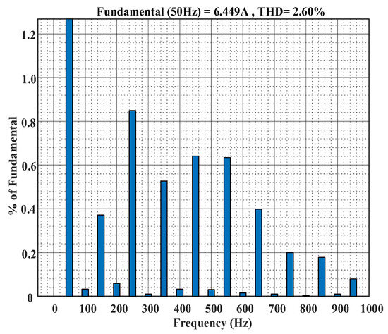 Figure 10, Figure 11, Figure 12 and Figure 13 depict the simulation waveforms of the proposed rectifier operating in boost mode. Figure 10 shows the simulation waveforms of input current iL1 and power supply voltage vs of the rectifier operating under high power factor. Figure 11 shows the input current harmonics of the rectifier, and a THD of 2.60% indicates an acceptable input current quality. Figure 12 shows the input voltage of the single-phase diode bridge rectifier, which demonstrates that the novel rectifier can achieve approximately three voltage levels operation under the given DC output voltage 200 V, which is consistent with the theoretical analysis. Figure 13 gives the simulation waveforms of vo, vo1, and vo2. It can be observed that the DC capacitor voltages vo1 and vo2 reach the reference voltage 100 V rapidly with a very small static error, and the DC output voltage vo is controlled stably at 200 V.