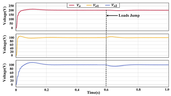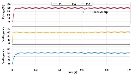 To verify the proposed capacitor voltage balancing control strategy, R1 jumps from 250 W to 125 W, while R2 jumps from 250 W to 375 W in the simulation. Figure 13 also shows that the DC capacitor voltages vo1 and vo2 and the DC-link voltage vo deviate from their stable value at the beginning of the load change, and then return to balanced again rapidly under the proposed DC capacitor voltage balancing control strategy.