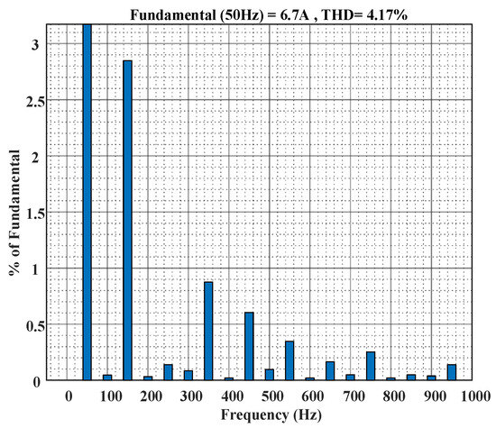 The experimental results are shown in Figure 16, Figure 17, Figure 18, Figure 19, Figure 20 and Figure 21. Figure 16 gives the experimental waveforms of the input current iL1 and power supply voltage vs, which shows that the proposed rectifier is operating under high power factor with approximately sinusoidal input currents. The input current harmonic spectrum is shown in Figure 17. It shows that the input current contains some low-order harmonics (3th, 7th and 9th).