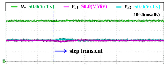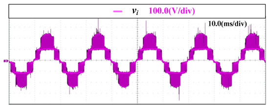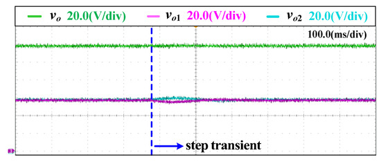 Figure 18 shows the experimental waveforms of the input voltage of the single-phase diode bridge rectifier operating under the given DC output voltage 200 V, which is consistent with the theoretical analysis. Figure 19 shows the experimental results of the DC-link voltage vo and the DC capacitor voltages vo1 and vo2 in boost mode. It can be seen that the DC capacitor voltages vo1 and vo2 reach the reference voltage 100 V rapidly with a very small static error, and the DC output voltage vo is controlled stably at 200 V. To verify the proposed capacitor voltage balancing control strategy, Figure 19 also indicates that vo1 and vo2, as well as vo, deviate from their references at load step transient, and return to being in balance again after about 100 ms.